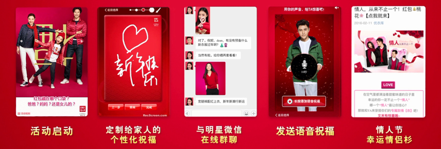 在移動互聯(lián)網(wǎng)的時代,時間、空間都得到了無限的拓展,我們無處無刻不處在鮮活的現(xiàn)實場景和虛擬場景中。移動媒體大大豐富和激活了營銷場景,也加速了現(xiàn)實場景和虛擬場景的交融互動,為我們創(chuàng)造了更大的營銷想象空間。比如春節(jié),對于零售品牌來說,就是一個具有戰(zhàn)略意義的節(jié)日。春節(jié)期間買新衣、發(fā)紅包、拜年,是中國人再熟悉不過的場景。2016年春節(jié),優(yōu)衣庫推出了“優(yōu)衣·幸運·穿回家”的主題推廣活動。優(yōu)衣庫與互動通攜手,在移動端推出了五波新年主題信息,制造不同的春節(jié)場景故事,如新春紅包大放送、陳坤倪妮喊你進群領(lǐng)紅包等,不僅展示了優(yōu)衣庫的品牌哲學(xué)與春節(jié)新裝,烘托出濃濃的春節(jié)氣氛,更讓人們積極互動、樂于分享。