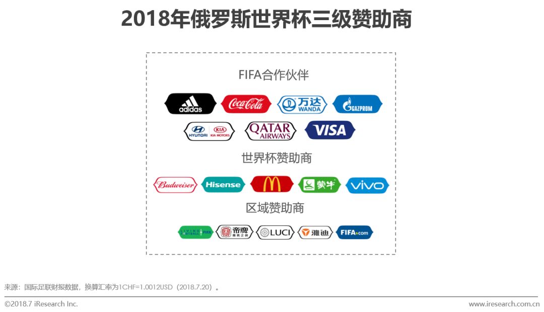 贊助方面,今年俄羅斯世界杯中國色彩濃厚。中國至少上陣7家贊助商,覆蓋三個贊助級別。TOP 2級別中,中國一共占據(jù)4席(萬達(dá)、海信、vivo、蒙牛),與美國(VISA、可口可樂、麥當(dāng)勞、百威)并列為贊助商最大輸出國。