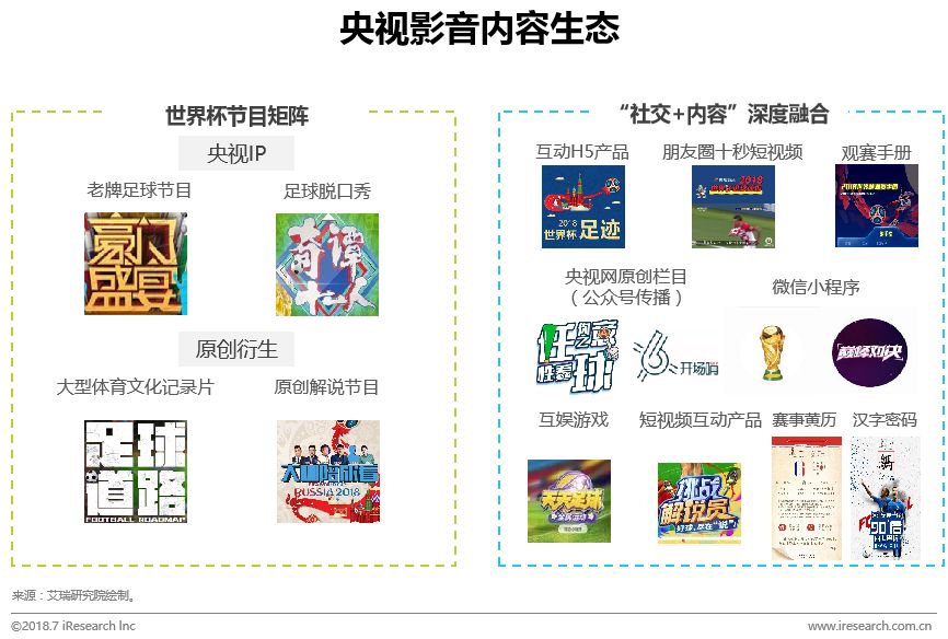 2018年世界杯,央視影音、優(yōu)酷、咪咕三大平臺都強(qiáng)調(diào)內(nèi)容生態(tài)構(gòu)建,拓寬球賽直播以外的新媒體內(nèi)容形式。以央視影音為例,依托央視的內(nèi)容資源和臺網(wǎng)聯(lián)動的渠道優(yōu)勢,打造數(shù)款互聯(lián)網(wǎng)特色產(chǎn)品,尤其是小微內(nèi)容產(chǎn)品。碎片化的產(chǎn)品能更充分利用社交鏈實現(xiàn)傳播,跨越圈層。