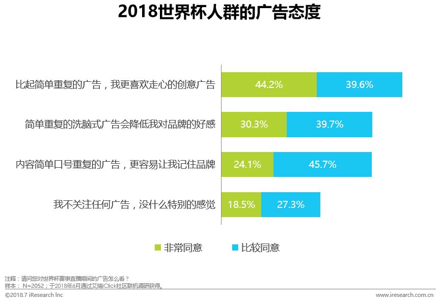 2018年俄羅斯世界杯賽程安排更符合國人收視習(xí)慣,64場比賽中有38場在24點前開球(含24點),其中10場更是在晚間黃金檔,因此整體關(guān)注度較高,表示“非常關(guān)注”的網(wǎng)民超四成。此外,本屆世界杯上的洗腦式廣告頗具爭議,對此有70%的世界杯人群認(rèn)為洗腦式廣告反而會降低品牌好感度,但同時,也有相當(dāng)比例的用戶承認(rèn)此舉的確更容易記住該品牌。