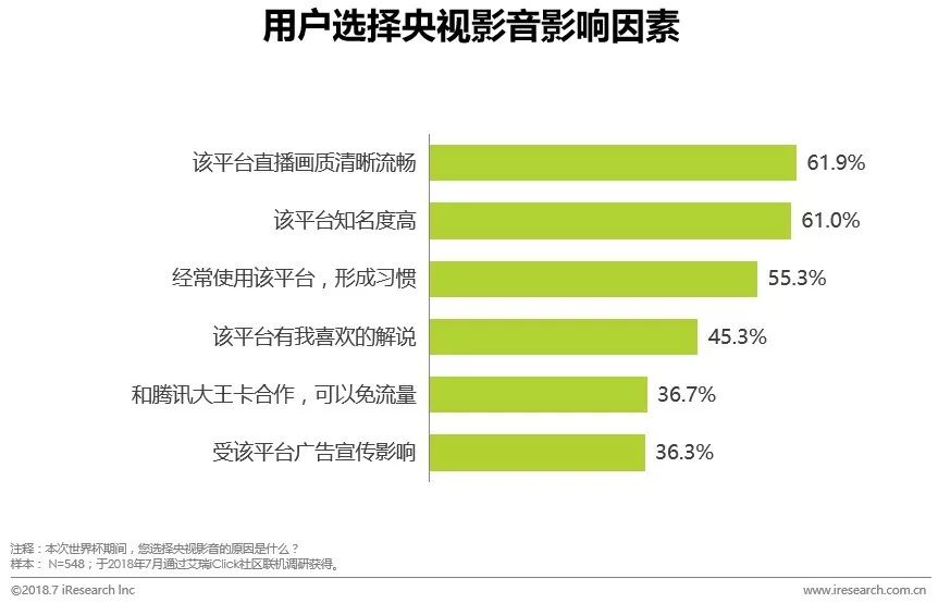 對于觀賽直播最看重的播放流暢度和視頻清晰度,滿意度也均達(dá)到85%。就用戶在世界杯期間選擇央視影音的影響因素而言,有超過60%的用戶是因為“直播畫質(zhì)清晰流暢”,同時認(rèn)可央視影音品牌知名度的用戶也高達(dá)60%。