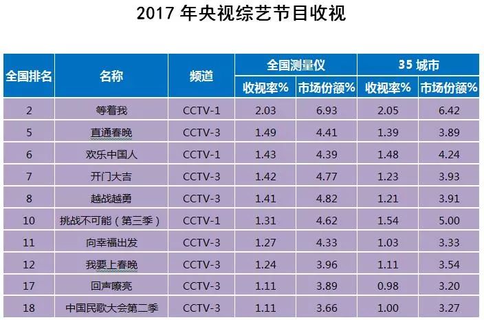 央視綜藝節目憑借精良的制作、強大的陣容和深厚的內涵,獲得了觀眾的高度認可。2017年,多檔全新綜藝欄目亮相央視熒屏,《歡樂中國人》《朗讀者》《國家寶藏》等新節目獲得了高評價。2017年全國綜藝節目排名前二十位中,央視占據了十席,其中前十位中占據六席。CCTV-1《等著我》收視率2.03%,獲全國網亞軍。