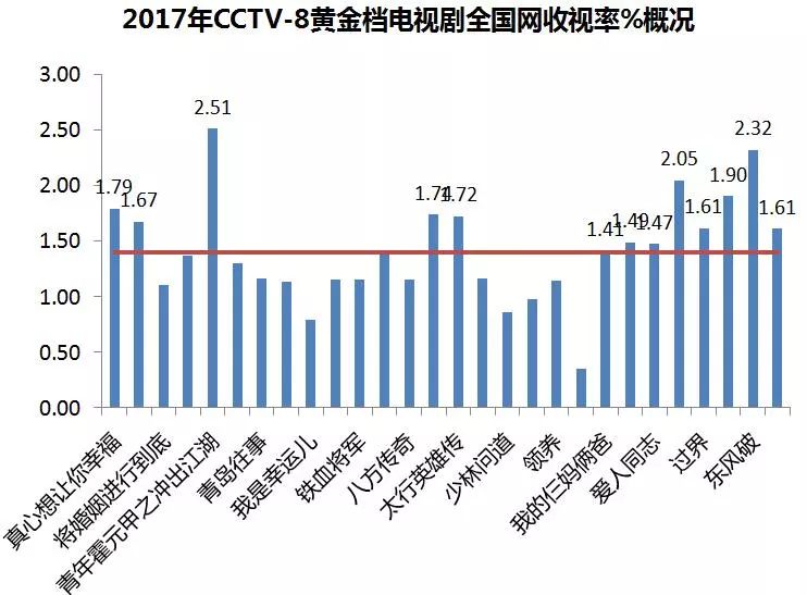 2017年,CCTV-8份額大漲0.53個百分點,獲全國網份額冠軍;黃金時段電視劇表現優異,全年平均收視率1.4%,9月開始,連續8部劇收視率均在全年平均收視率之上。全年收視前三的電視劇分別是《青年霍元甲之沖出江湖》2.51%、《東風破》2.32%、《飛哥戰隊》2.05%,收視率均超過了2%。