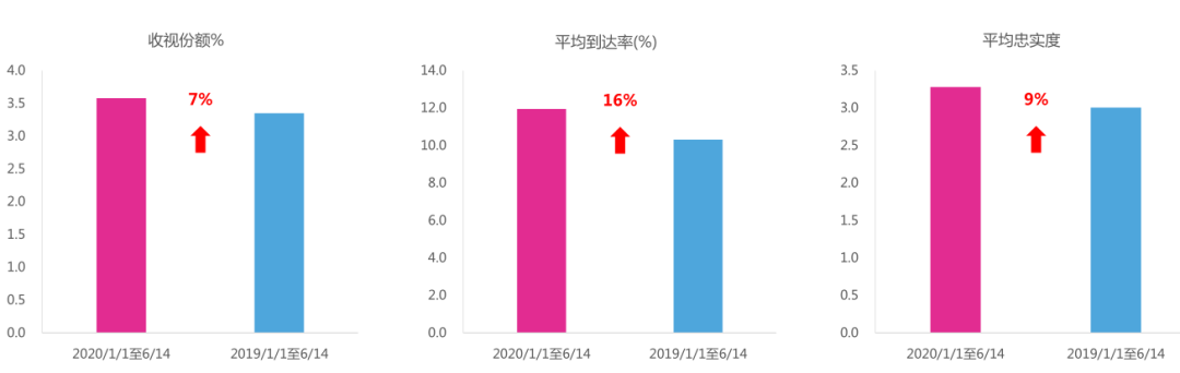 CCTV-4與去年同期相比,各項指標明顯上升。截止到6月14日,CCTV-4收視份額相比去年同期上漲了7%,平均到達率上漲16%,平均忠實度上漲9%。