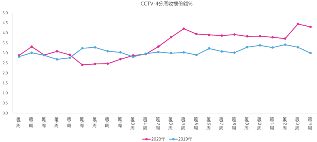 CCTV-4近四周均列上星頻道冠軍,自第12周起市場份額超越去年同期。