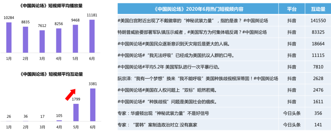 熱點事件推動《中國輿論場》短視頻播放量與互動量飆升。6月份短視頻最高互動量達到141550次,平均播放量達到11181次。