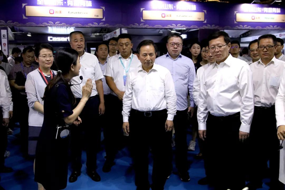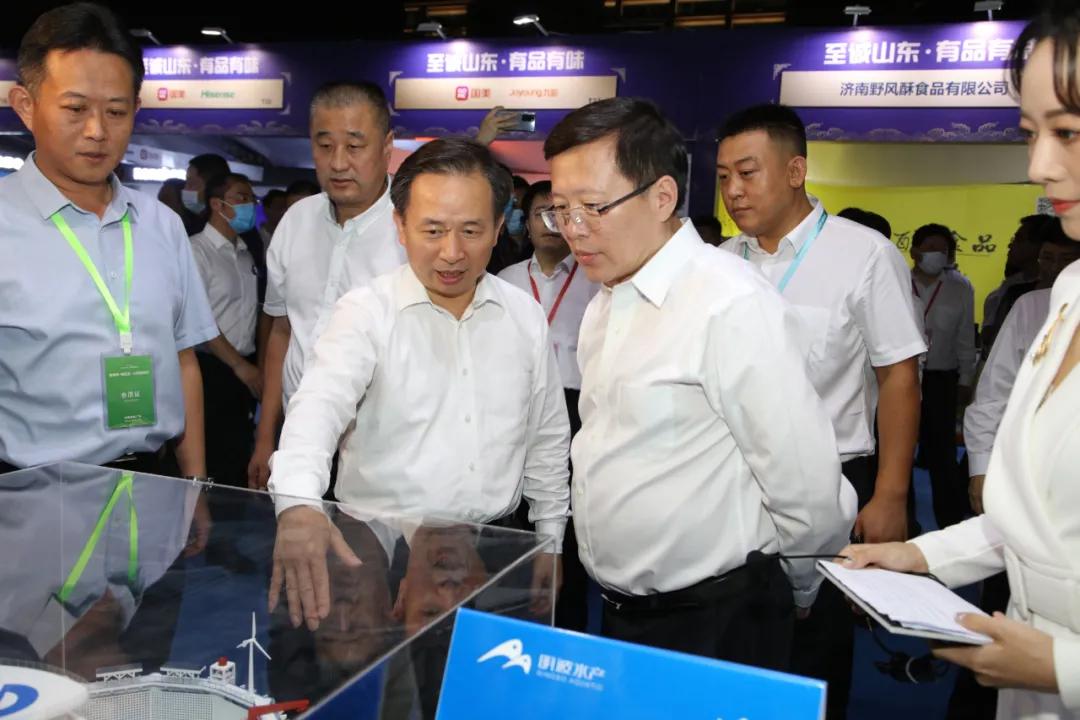 在泉城廣場上的商品展銷區,海爾冰箱、海信電視、青島啤酒、華熙生物、山東煎餅、周村燒餅等山東名優產品琳瑯滿目。