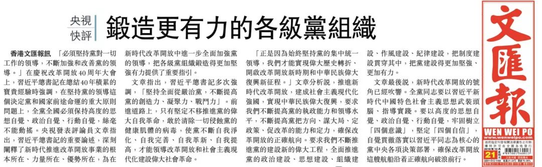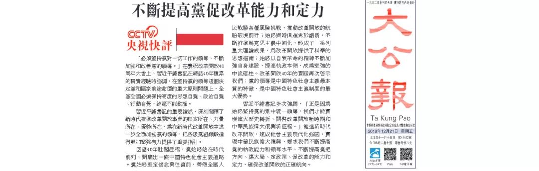 12月21日,香港《大公報》和香港《文匯報》同時轉(zhuǎn)發(fā)了中央廣播電視總臺央視新聞19日刊播的《央視快評:不斷提高黨把方向謀大局定政策促改革的能力和定力》。報道內(nèi)容如下: