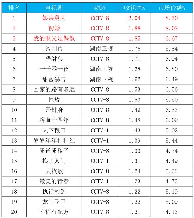 今年的電視劇市場中,CCTV表現十分活躍,提振信心,量能持續釋放。截至11月14日,全國收視率前十的電視劇中,CCTV包攬前三,占據7席,《娘親舅大》成為今年唯一全劇收視率破2%的電視劇。在電視劇收視率前20榜單中,CCTV更是大舉占據了17席之多,斬獲85%頭部市場份額,王者地位無可撼動,主流題材電視劇的春天正在加速升溫。