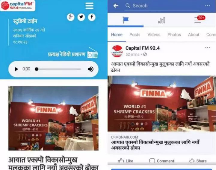 尼泊爾Capital FM92.4都市調頻臺網站和facebook賬號2018年11月10日轉發