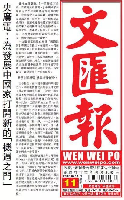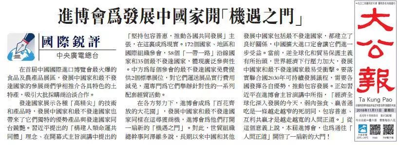 中央廣播電視總臺“國際銳評”11月10日刊播題為《進博會為發展中國家打開新的“機遇之門”》的文章,多家境外媒體轉載和引用。