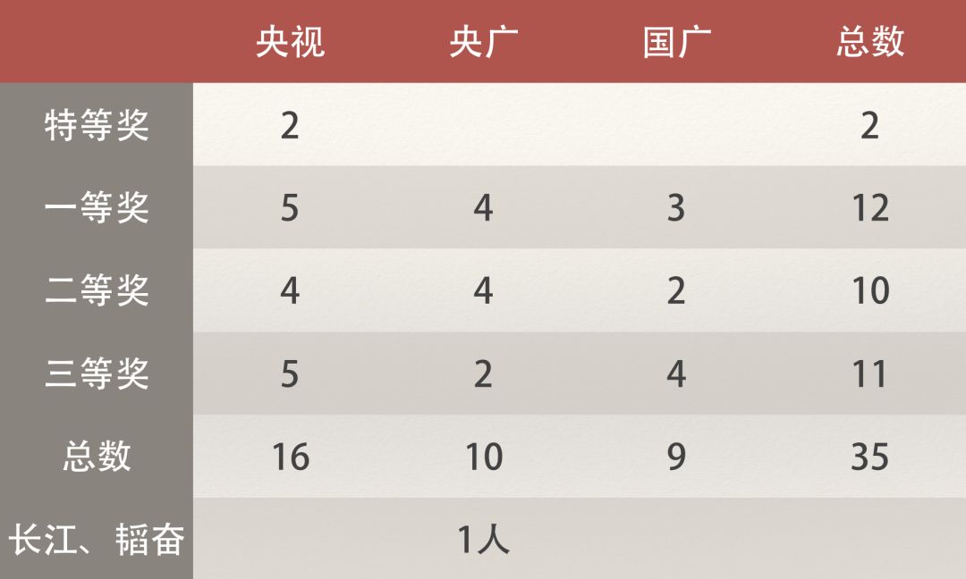 中央廣播電視總臺所屬央視、央廣、國廣以35件作品的獲獎總量位居全國各級各類媒體首位。其中,《將改革進行到底》和《央視網零首頁十九大報道矩陣設計》獲得了特別獎,《初心》等12件作品獲得一等獎,1人獲得了長江韜奮獎。
