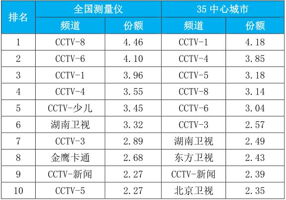 2018年截至10月23日,全國(guó)上星頻道份額排名中,央視頻道在全國(guó)網(wǎng)占8席,中心城市占7席,均較去年同期增加1席,其中全國(guó)網(wǎng)包攬前五,中心城市包攬前六。CCTV-8獲全國(guó)網(wǎng)排名冠軍,份額4.46%;CCTV-1獲中心城市排名冠軍,份額4.18%。