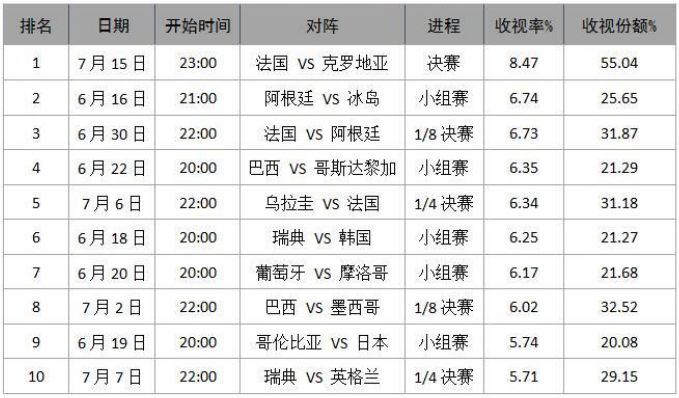 7月15日法國(guó)VS克羅地亞的巔峰之戰(zhàn),最高收視率達(dá)到9.46%,高于2014世界杯決賽的收視高峰7.03%。共有9060萬(wàn)觀眾通過(guò)CCTV-5和CCTV-1收看了2018年世界杯決賽,所覆蓋觀眾人數(shù)是上屆巴西世界杯的2.08倍。