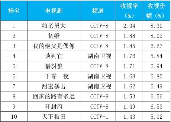 截至10月23日,2018年全國(guó)網(wǎng)電視劇收視榜單中,中央電視臺(tái)在前十中占據(jù)七席,其中CCTV-8包攬全國(guó)網(wǎng)前三,《娘親舅大》收視率2.04%,為今年唯一收視率過(guò)2%的電視劇。在多款霸屏之作推動(dòng)下,CCTV-1、CCTV-8整頻道份額均出現(xiàn)增長(zhǎng),CCTV-8更是登上全國(guó)網(wǎng)冠軍寶座。