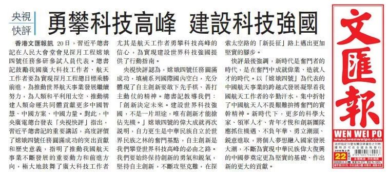 香港《文匯報》有關《勇攀科技高峰 建設科技強國》的轉發報道內容如下: