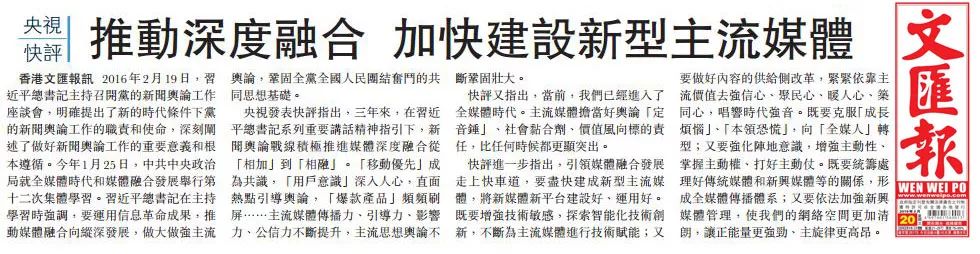 香港《文匯報》有關《推動深度融合 加快建設新型主流媒體》的轉發報道內容如下: