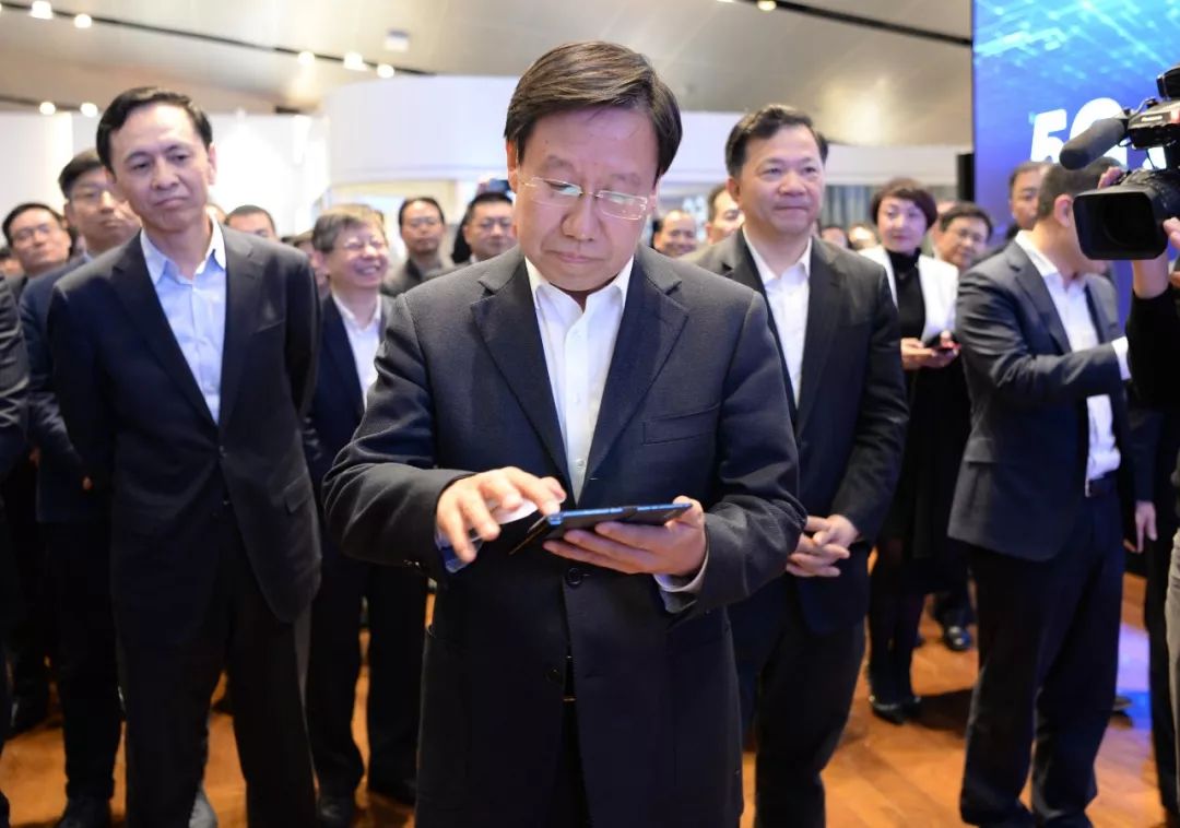 △中宣部常務副部長王曉暉(中)通過華為5G折疊手機進行4K節目投屏操作