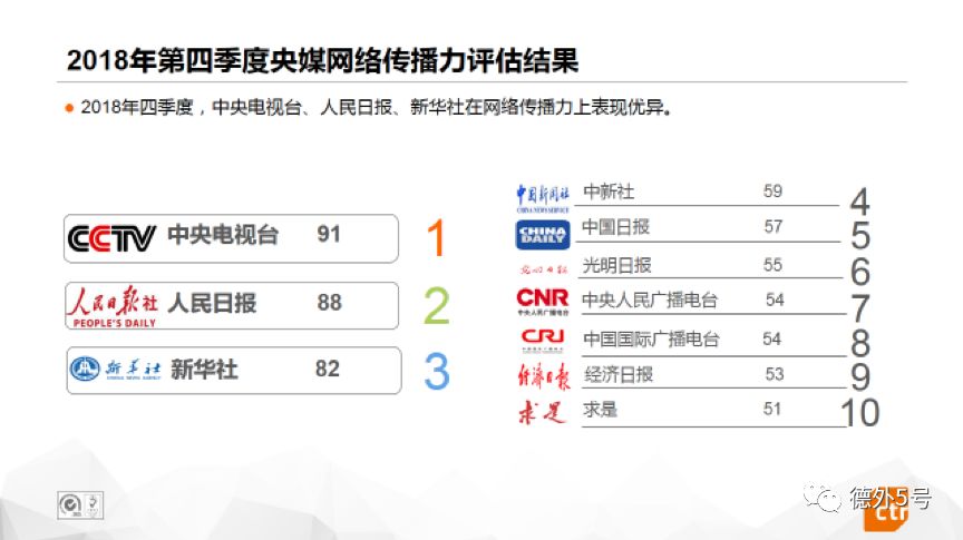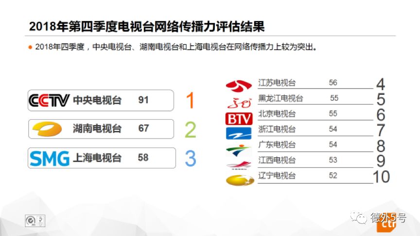 近日,在CCBN中國國際廣播影視發展論壇上,央視市場研究(CTR)發布了2018年媒體融合網絡傳播效果評估結果。從2018年第四季度的評估結果來看:中央電視臺網絡傳播力高居榜首,中央人民廣播電臺與中國國際廣播電臺進入前十;中央電視臺、湖南臺和上海臺網絡傳播力位居省級以上電視臺前三。